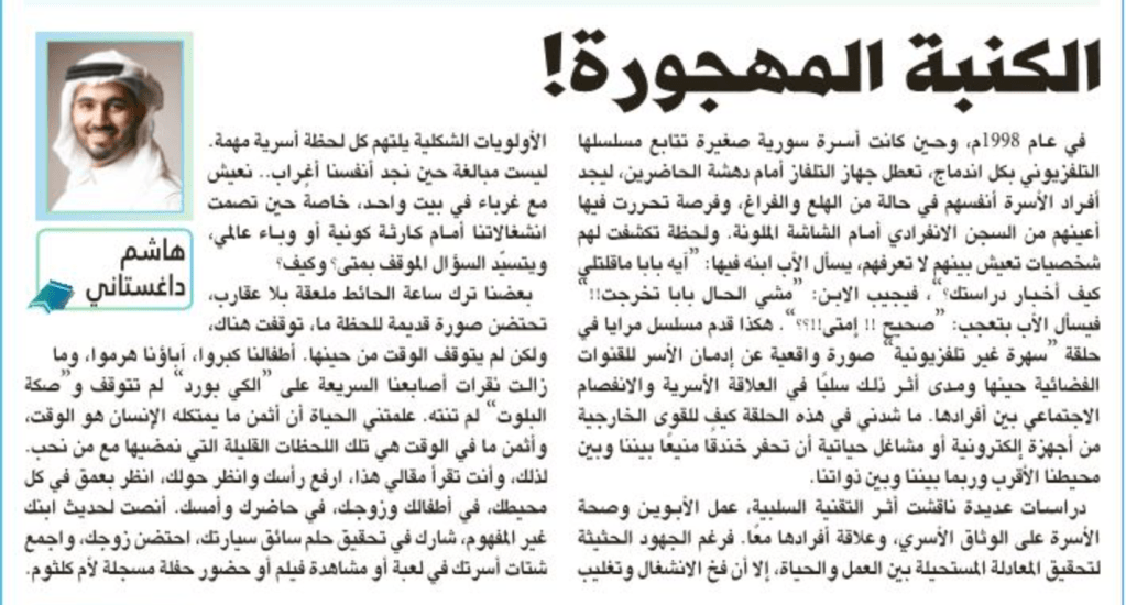 في عام ١٩٩٨م، وحين كانت عائلة سورية صغيرة تتابع مسلسلها التلفزيوني بكل اندماج، تعطل جهاز التلفاز أمام دهشة الحاضرين، ليجد أفراد الأسرة أنفسهم في حالة من الهلع والفراغ، وفرصة تحررت فيها أعينهم من السجن الانفرادي أمام الشاشة الملونة. ولحظة تكشفت لهم شخصيات تعيش بينهم لا تعرفهم، يسأل الأب ابنه فيها : “آيه بابا ماقلتلي كيف أخبار دراستك؟”، فيجيب الابن: “مشي الحال بابا تخرجت!!” فيسأل الأب بتعجب: “صحيح !! إمتى!!؟؟”. هكذا قدم مسلسل مرايا في حلقة “سهرة غير تلفزيونية” صورة واقعية عن إدمان العوائل للقنوات الفضائية حينها ومدى أثر ذلك سلباً على العلاقة الأسرية والانفصام الاجتماعي بين أفرادها. ما شدني في هذه الحلقة كيف للقوى الخارجية من أجهزة إلكترونية أو مشاغل حياتية أن تحفر خندقاً منيعاً بيننا وبين محيطنا الأقرب وربما بيننا وبين ذواتنا.