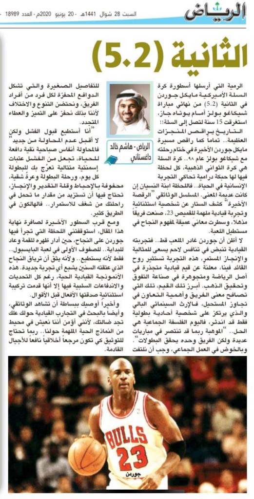 التاريخ يراقص المنجزات العظيمة .. تماماً كما راقص مسيرة مايكل جوردن الأخيرة في ختام رحلته مع شيكاغو بولز عام ٩٨ .. كرة السلة هي كرة الثواني الذهبية، كل لحظة فيها لها حبكة درامية تحاكي التجربة الإنسانية في الحياة .. فاللحظة ابنة النسيان إن كانت عديمة المعنى. المسلسل الوثائقي “الرقصة الأخيرة” كشف الستار عن شخصية استثنائية وتجربة قيادية ملهمة للقميص 23، صنعت فريقاً مذهلاً، وسطرت معانٍ عميقة لمفهوم النجاح في مستطيل اللعبة.