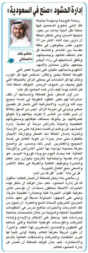 إن سألتني ماذا يمكن للمملكة أن تُصدّر للعالم؟ سأقول لك فن إدارة الحشود. نعم، حان الوقت أن ننظر لهذه الخبرات الأصيلة بمنظور مستدام، أن نؤسس لمنابر معرفية تقولب التجربة كتباً ومصادراً تعليمية مثرية، و نبني على الجهود المبذولة مسبقاً في معهد خادم الحرمين الشريفين لأبحاث الحج والعمرة. أن نحول من تلك الممارسات والخبرات مناهج تدرس في المنظومات التعليمية المحلية والدولية من خلال تخصصات جامعية ودراسات عليا. و نحفز على الابتكار والإبداع وإنشاء الشركات والمؤسسات الوطنية الناشئة والتي تساهم في التطوير والتحسين المستمر لهذا العلم. وأخيراً، أن نكون شريكاً معرفياً للعالم، وقبلة أولى تلجأ لها كبرى المنظمات والشركات والمسابقات العالمية بالدعم والاستشارة. نعم، حان الوقت للمملكة أن تُصدّر فن إدارة الحشود للعالم.